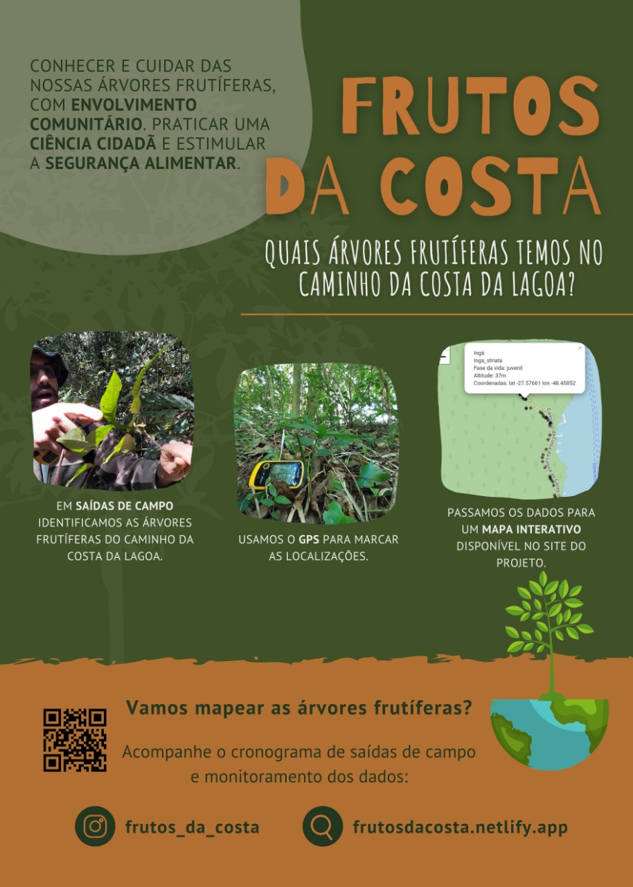 A ideia de mapear as árvores frutiferas surgiu de uma conversa com o amigo Euler Erse sobre sustentabilidade e segurança alimentar. Durante um brain storming surgiu uma pergunta fundamental que foi moldando a ideia conforme avançávamos no exercício da dialética. A pergunta primeira foi “quais as árvores frutíferas que alimentam o homem existem na região da Costa da Lagoa?”. Fizemos uma lista de espécies que já vimos aqui ou que sabíamos que existiam na região. Então, nos propomos a fazer um levantamento das espécies para termos certeza de quais e quantas eram. Para aumentar a resolução e qualidade da informação, resolvemos georreferenciar e depois mapear os dados.
